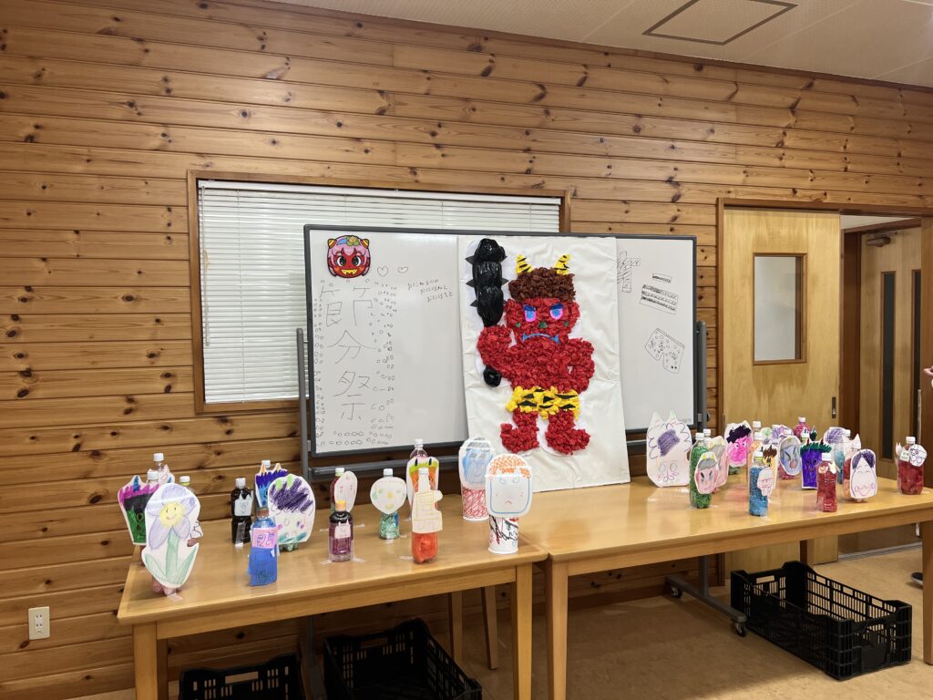 事前に用意したのは、花紙で作った大きな鬼のボードと鬼のお面がついたペットボトル。