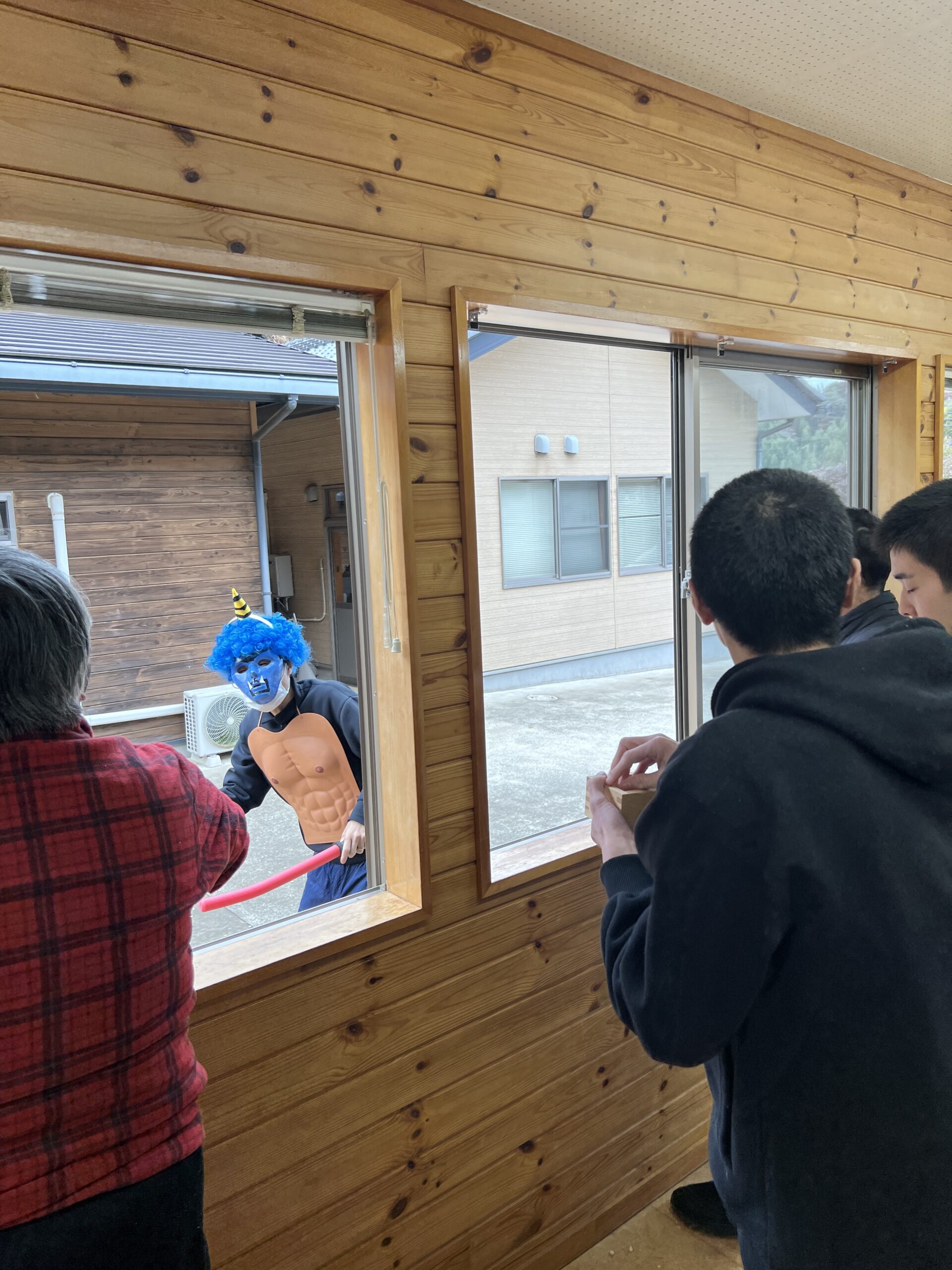 豆まきの準備をしていると、建物の裏から赤鬼・青鬼が登場( ゚Д゚)!